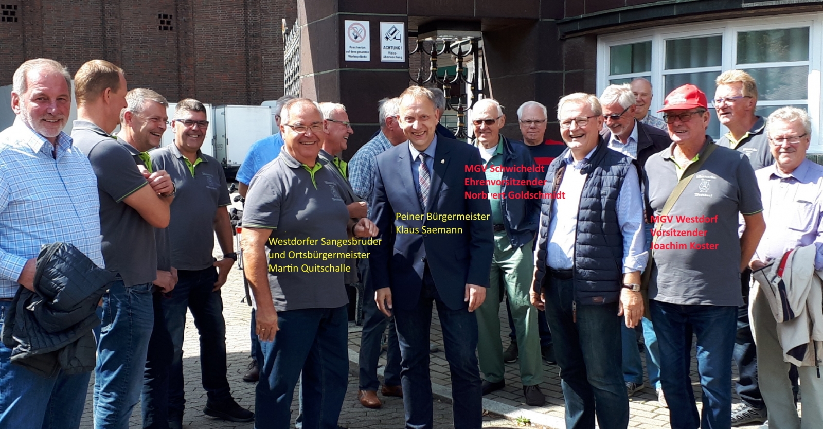 Die Schwicheldter luden die Gäste zu einem Besuch der Härke-Manufaktur ein, und Peines Bürgermeister Klaus Saemann (Bild unten Mitte mit dem Westdorfer Ortsbürgermeister Martin Quitschalle) ließ es sich nicht nehmen, die Sänger aus Schwicheldt und Westdorf kurz zu begrüßen und ihnen einen schönen Tag zu wünschen. Den hatten die Sangesfreunde um den Westdorfer MGV-Vorsitzenden Joachim Koster (Bild unten 3.v.r.) und Schwicheldts MGV-Ehrenvorsitzenden Norbert Goldschmidt (8.v.r.) gemeinsam bei Härke und bei einem anschließenden Beisammensein, bei dem durch vielfältigen Austausch von Gedanken und Erinnerungen der Kontakt vertieft wurde.